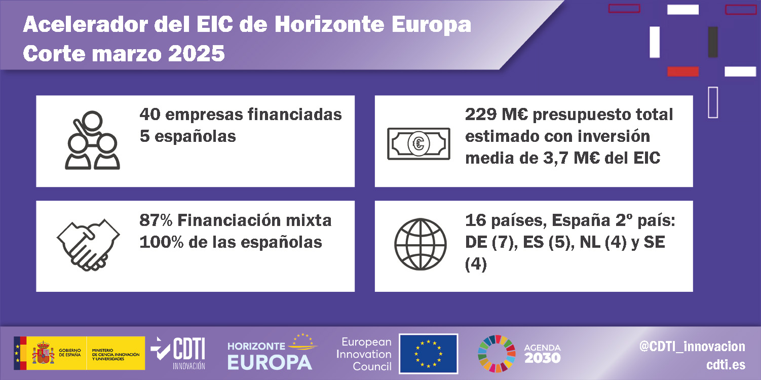 El Consell Europeu d'Innovació (EIC) d'Horitzó Europa ha seleccionat per a finançament a 40 empreses innovadores en l'Accelerador, cinc d'elles espanyoles, situant a Espanya com a segon país per nombre d'empreses finançades en aquest tall
