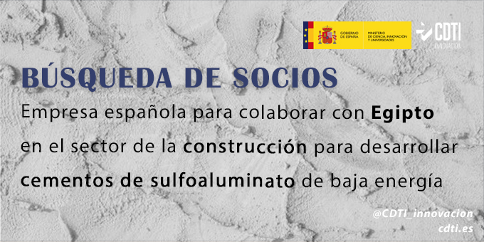 The CDTI Innovation disseminates a new search of a spanish company in the construction sector that is interested in developing, in collaboration with the National Research Center of egypt, cements sulfoaluminato of low-energy