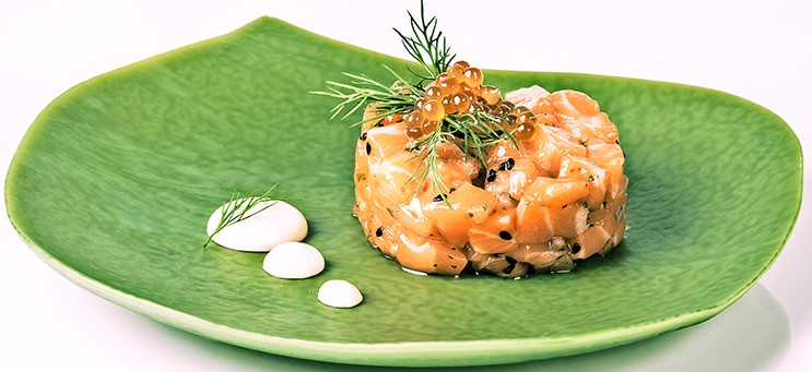 Tartar de salmón con Caviaroli de aceite de sésamo