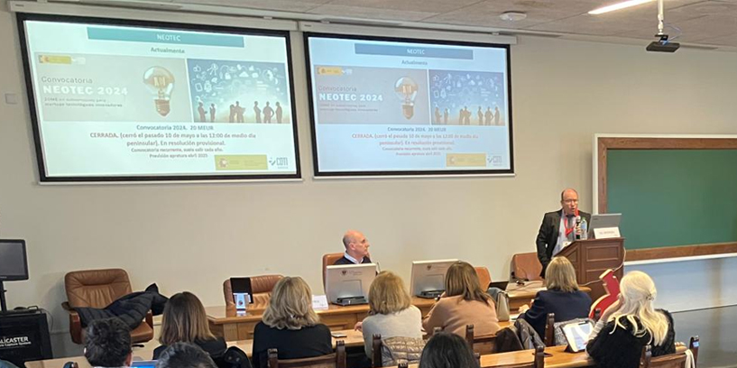 Juan Luis Romera, técnico del departamento de Promoción Institucional y Cooperación Territorial del CDTI Innovación, ha participado en el Taller de Financiación al Desarrollo Empresarial, la Creación de Empresas y la I+D+i y ha expuesto los principales programas e instrumentos que gestiona este Centro para ayudar a las empresas innovadoras que apuestan por la I+D+i, entre los que cabe mencionar: el programa NEOTEC, Eurostars, las Ayudas Parcialmente Reembolsables (APRs), las inversiones de capital a través de INNVIERTE y de la Compra Pública Precomercial, entre otros.