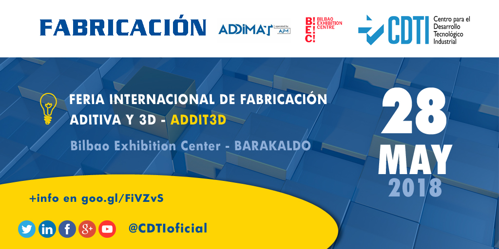 Del 28 de mayo al 01 de junio 2018, @CDTIoficial participa en ADDIT3D, la Feria Internacional de Fabricación Aditiva y 3D, que formará parte de BIEMH 2018, la Bienal Española de Máquina y Herramienta organizada por el Bilbao Exhibition Center y Addimat.