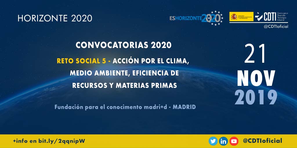 - Marcadores: @CDTIoficial @EsHorizonte2020 @madrimasd @EU_Commission @EU_H2020 #H2020 #Horizonte2020 #Medioambiente #AccionporelClima #cambioclimatico