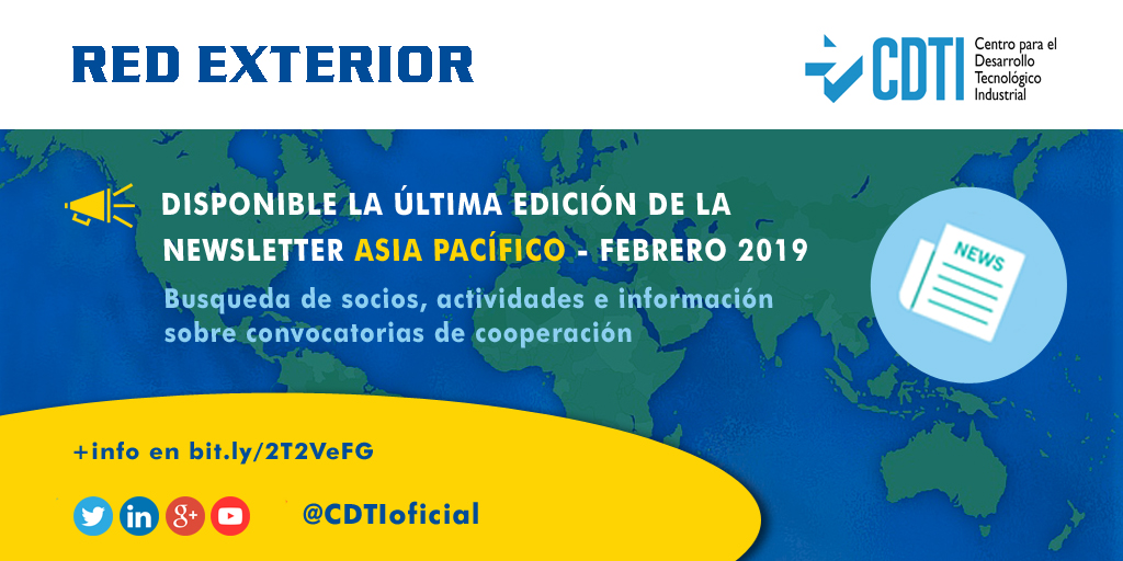 Ya se encuentra disponible en la página web de @CDTIoficial la última Newsletter de la Red Exterior correspondiente a febrero de 2019, con información sobre las actividades del CDTI en Asia Pacífico. El documento incluye noticias, convocatorias actualmente abiertas, eventos, ferias y expresiones de interés recogidas para la búsqueda de socios españoles en el ámbito de la I+D con Australia, China, Japón y Taiwán.